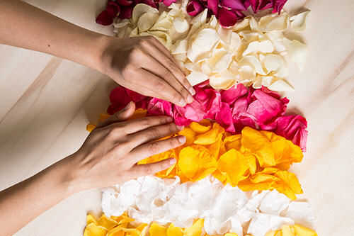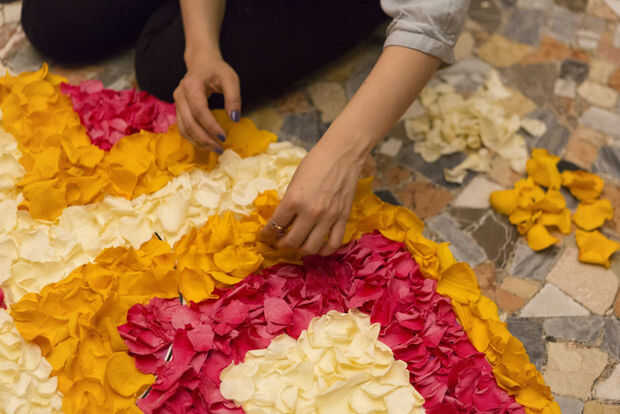 8. rociar el pegamento sobre el papel impreso y coloque los pétalos en el patrón.
