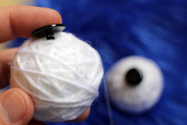 Usé botones brillante plástico negro para las pupilas en los ojos. Usando más amenaza de la blanco y una aguja los botones fueron cosidos en cada globo ocular de hilado.