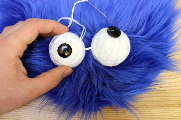Los ojos se sujetan con hilo de bordar blanco grueso. Después de cada ojo fue unido a la cabeza de la alfombra de piel, que los ojos fueron cosidos juntos para proporcionar estabilidad. Este monstruo tiene ojos loco, así que recuerde poner los ojos un poco cruzados.