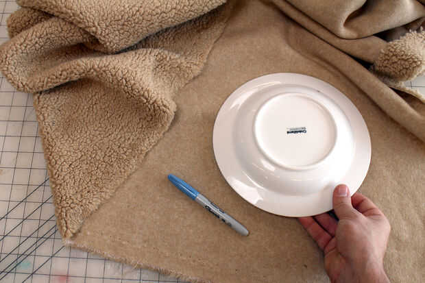 ¿Qué sería sin unas galletas de peluche grandes para ir a lo largo de este amigo peludo? Hice las galletas de viruta de chocolate grande de alguna tela beige suave. Utilicé un plato grande para trazar el contorno de la parte inferior de la tela, a continuación, cortar dos círculos iguales de la traza.