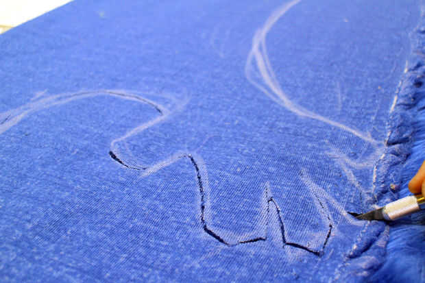 Cuando era feliz con una forma de contorno usé un cuchillo de la manía aguda para cortar cuidadosamente a través de la capa superior de la tela. Corte de tiempo tome alrededor de áreas detalladas como los dedos, este detalle se mostrará en la alfombra.