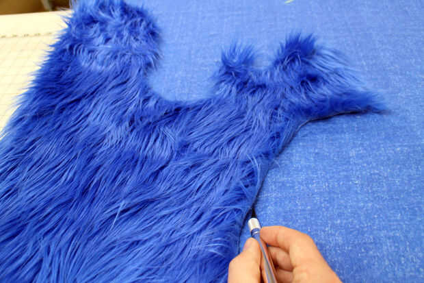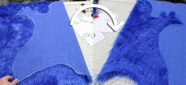 Después de cortar un lado del diseño voltee la piel y doblar por la mitad, esta vez que será la piel en la parte exterior del doblez. Ahora usted puede cortar el otro lado de la alfombra del monstruo hacia fuera con el lado cortado previamente como guía.