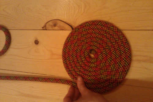 hoy, mostrará usted cómo hacer una alfombra reutilizando la vieja cuerda.Lo que usted necesita:-Cuerda-Fuego (encendedor, vela, etc....)-Pegamento-CartónPaso 1: Girar la cuerda Para empezar la alfombra, asegúrese de que su sobre una superficie plana,
