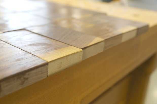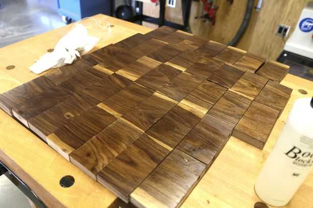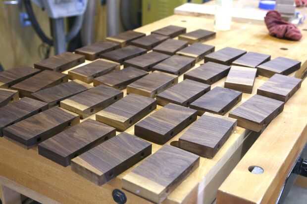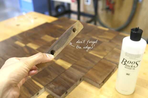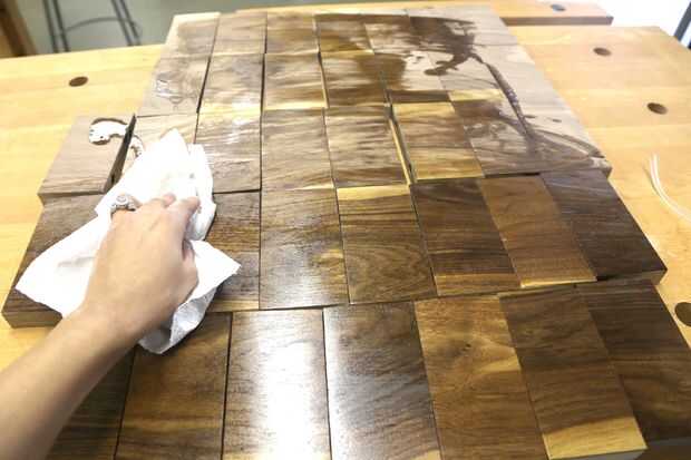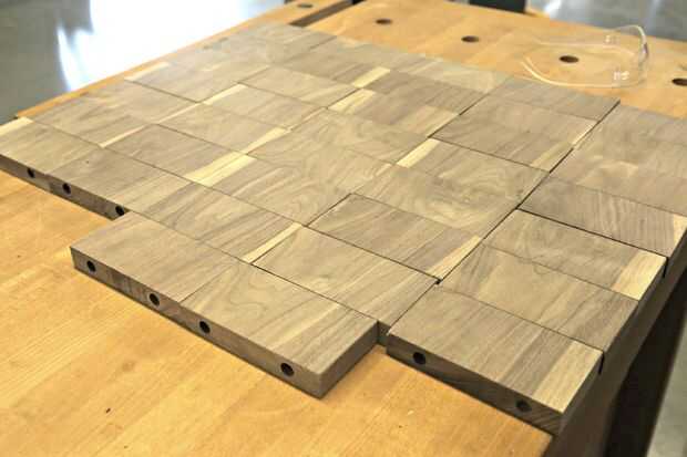 Después de realizados todos los agujeros, decidí aprovechar mi dinero trayendo la hermosa veta de la madera de nogal. Utilicé aceite de misterio cerradura Boos para lograrlo. Este material es fenomenal! Rociar el aceite sobre la superficie de los bloques de la nuez, manchado alrededor, luego se limpió el exceso. Hice 3 capas de este, recuerda no descuidar los bordes! Este paso fue realmente gratificante! Mira el color increíble!