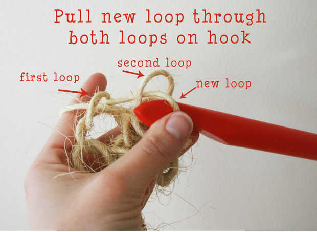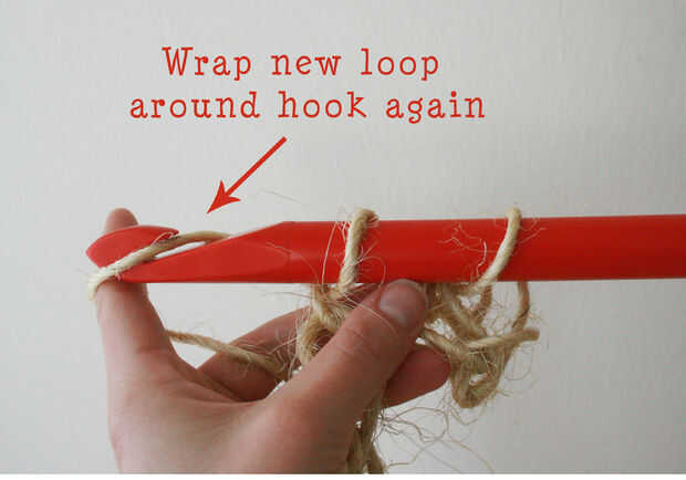 Inserte el gancho en la segunda cadena del gancho. Envuelva el sisal alrededor del gancho al igual que en el último paso.