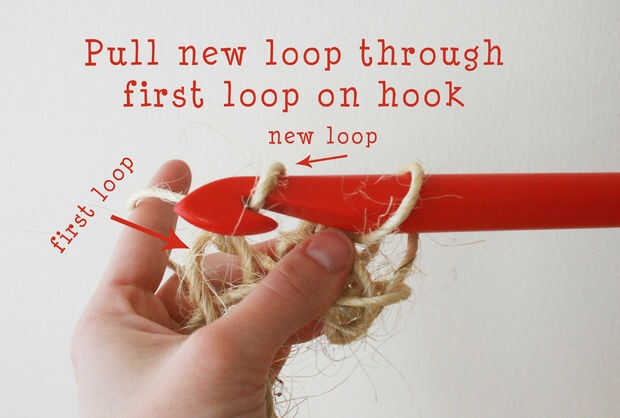 Tire el sisal a través del primer lazo solamente. Esto te deja otra vez con dos lazos en el gancho.