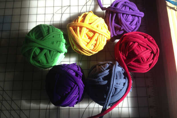 Mi fuente de camiseta fue agotado de mi proyecto anterior así que fui a buena voluntad y tienen varias camisetas XXXL... tratando de conseguir solamente todos algodón. Que les lavaron y luego t-shirt yarn...