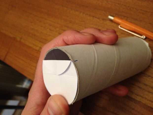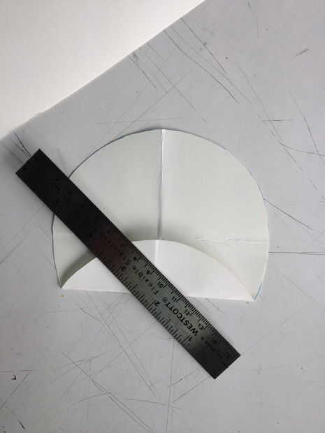 A continuación, doblar el círculo por la mitad verticalmente y horizontalmente para que se divida el círculo en cuartos iguales. Luego doblar uno de los puntos de borde que creó en el punto medio del círculo. Ahora tienes el diámetro dividido en cuatro partes. Los recortes en los tubos deben ser un cuarto del diámetro del tubo a cada lado (ver imagen 2 en el paso 1 para un visual).