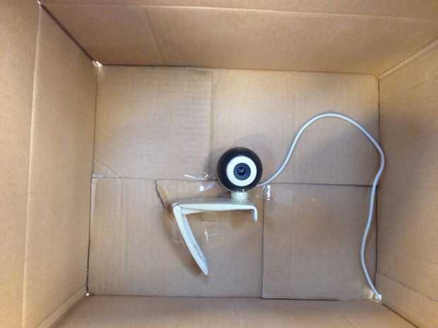 Corte un pequeño agujero en una esquina inferior de la caja por donde pueden ir el cable y USB de la webcam. Cinta de la cámara web en la parte inferior de la caja, en la forma que fue explicada en el paso 1.
