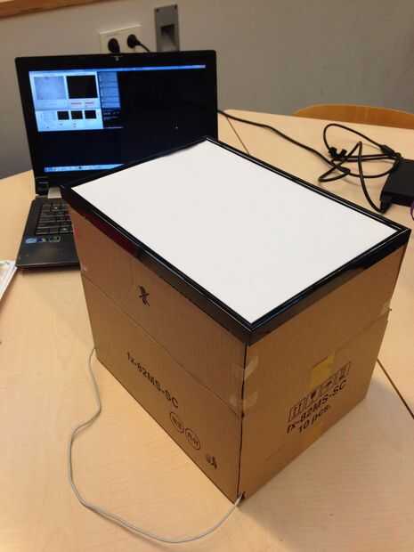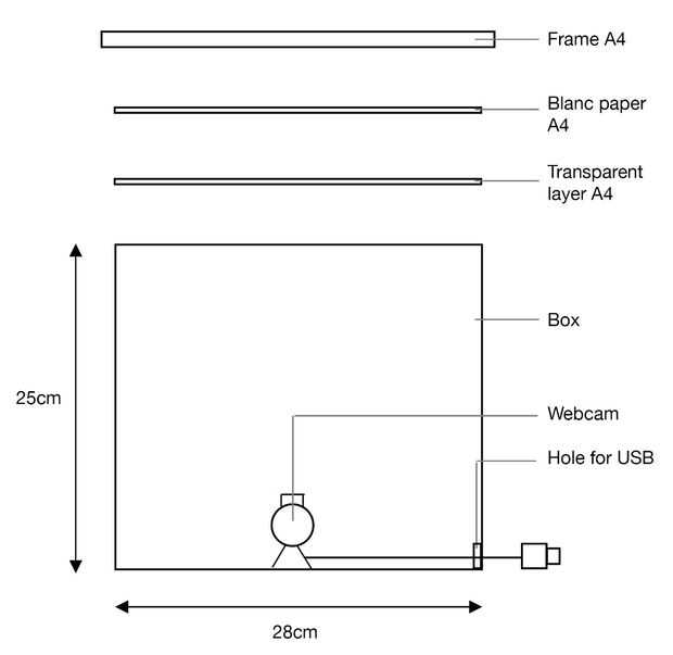 La superficie de contacto existirá un Blanc A4 papel encima de un A4 tamaño hoja de vidrio acrílico. Para dar más rigidez a esta superficie, puede cinta ambas hojas en un marco de A4, o un marco que creó usted mismo de una tapa de cartón.