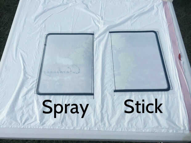 • Aplicar uniformemente un tapete con el adhesivo en aerosol. Sujete la placa por una esquina y no rocíe cerca de cualquier cosa que no desea cubierto de pegamento.