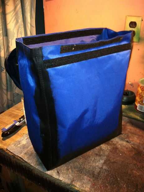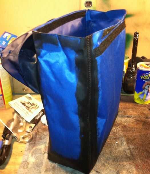Ya había comenzado las bolsas de la capa. El material es una lona de poliéster. Soldó con autógena la parece junto con un plano con punta de soldadura de hierro y poner puntadas de zig-zag para agregar fuerza.  Simplemente corte un pedazo largo de material y había hecho un cuadrado U fuera de él. Entonces usé dos trozos del rectángulo para los lados y la buena vieja velcro para el cierre.