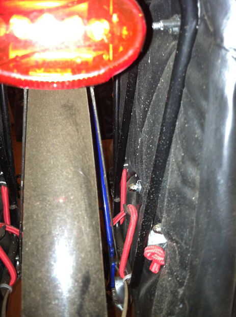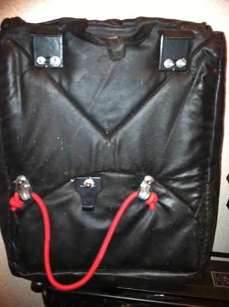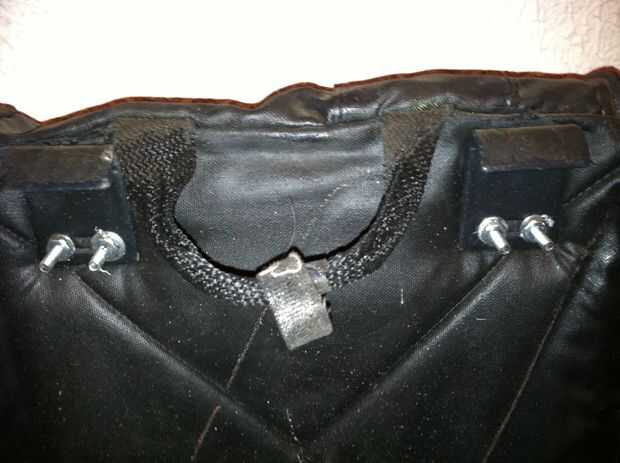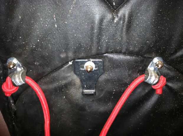 El mecanismo de montaje en la parte trasera. Bungie se envuelve alrededor de la barra inferior de la parrilla trasera y volver al gancho para proporcionar tensión. Utilicé la misma forma de "L" de un signo de elección (coroplast) en el interior para conservar forma y agregar rigidez. En estas bolsas traseras tengo una doble capa de coroplast de anidación - tipo de spooning - para agregar resistencia por lo que puede manejar más peso sin distorsionar. También usé la misma correa de aluminio como una arandela - que se extiende entre los dos ganchos superiores y uno entre los parte dos inferior ganchos.