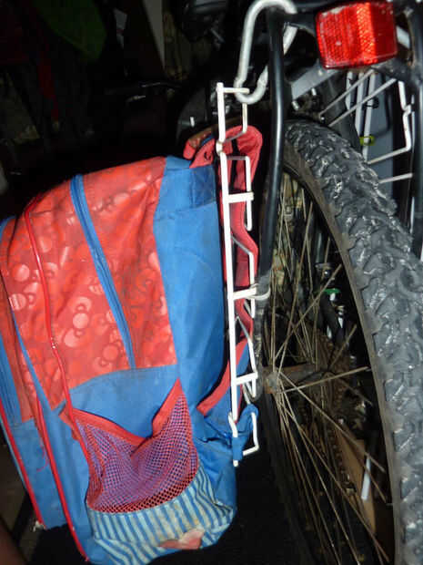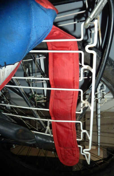 Con el fin de colocar las mochilas, probablemente usted necesitará cortar los extremos de las correas como se muestra. De esta manera usted puede tomar la parte superior, rellena parte de la correa y "teje" a través del marco de pannier, comenzando en la parte superior. Luego se ata la parte acolchada y no rellenado parte juntos, probablemente después de colocación la parte no rellenada a través del marco de la maleta un par de veces para mayor seguridad.