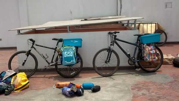En la foto es dos bicicletas completadas con maletas hechas a mano, listo para un día 4, 70 + km/día de trek en Perú! El uno en el frente todavía tenía sus bolsas adjunta 3 meses de uso Off-Road más adelante, aunque había un par de agujeros y ya no eran tan vibrantes.