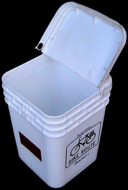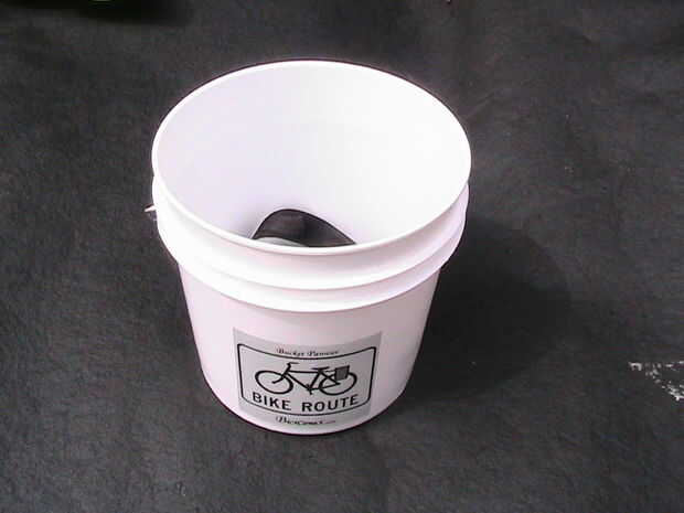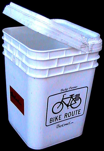 Yo no soy la primera persona en un cubo en mi bicicleta, o el primero en tratar de vender cubos como una alforja bicicleta del gancho, pero he venido para arriba con el simple sistema de seguro. He visto cómo otras personas enganchan cubos en sus bicicletas y trataron de copiarlos, pero quería algo que es estable, fácil de quitar y no comprometer el cubo por orificios de perforación. Un día se me ocurrió la idea, todo lo que necesita para sostener un cubo en mi estante de la bici es un simple alambre doblado!