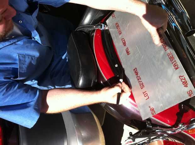 Primero toma la hoja de aluminio y lo siguiente el guardabarros de la moto y la marca que para la longitud, que debe extenderse al menos 1" de ambos tornillos para que las piezas es por lo menos 2" de largo que la distancia entre los dos pernos para bolsas de montaje.