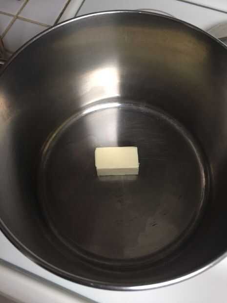 Poner una media barra de mantequilla sin sal en una olla o sartén hasta que se derritan completamente hacia abajo. Esto evitará que el resto de los ingredientes de que se pegue al fondo y quema.