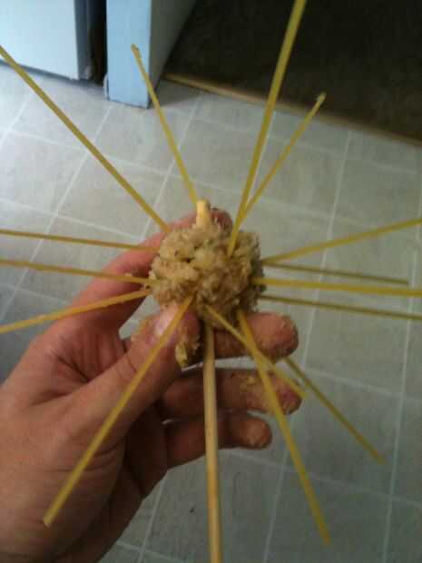 3. Inserte con cuidado fideos Linguini de la albóndiga. El centro de los tallarines debe estar dentro de la albóndiga. 10 fideos por albóndiga.