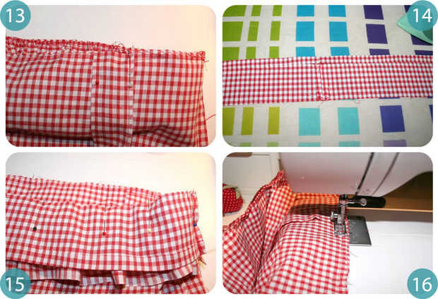 16 - cose alrededor de la parte superior de la bolsa con un margen de costura de media pulgada, ir poco a poco si es necesario que será coser a través de la bolsa, volante, parte de arriba y manijas.
