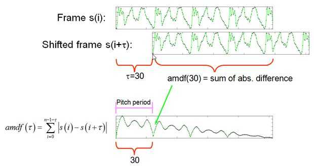 AMDF (función de diferencia de la magnitud de autocorrelación) es básicamente líneas superpuestas de seguimiento en una determinada ventana de muestras. Esto es básicamente lo que ocurre: