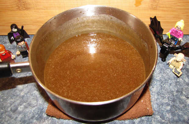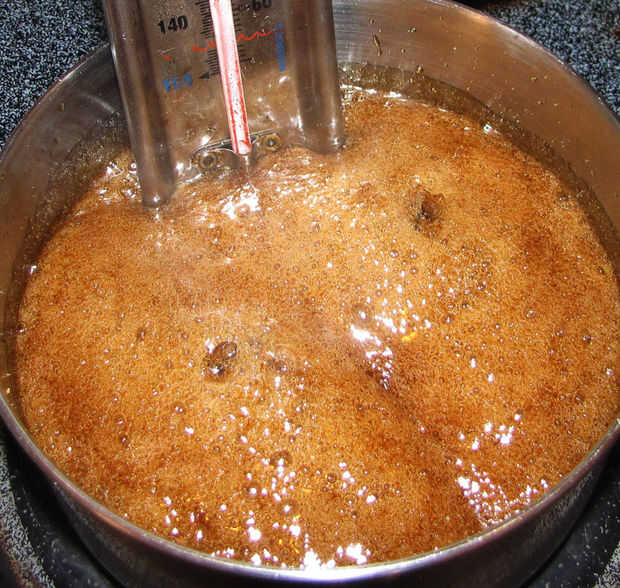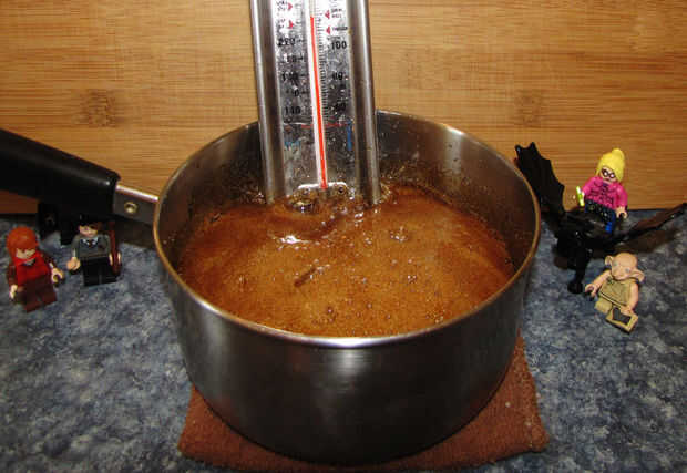 1. en una olla pequeña combine el azúcar y el agua, luego llevar a un hervor sobre fuego medio. Seguimiento de la temperatura con un termómetro de caramelo.