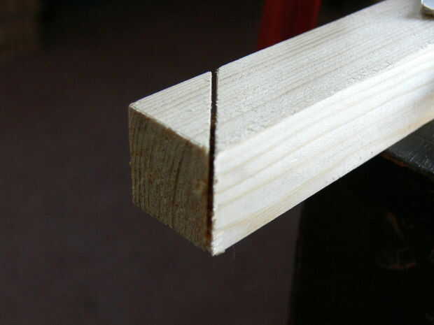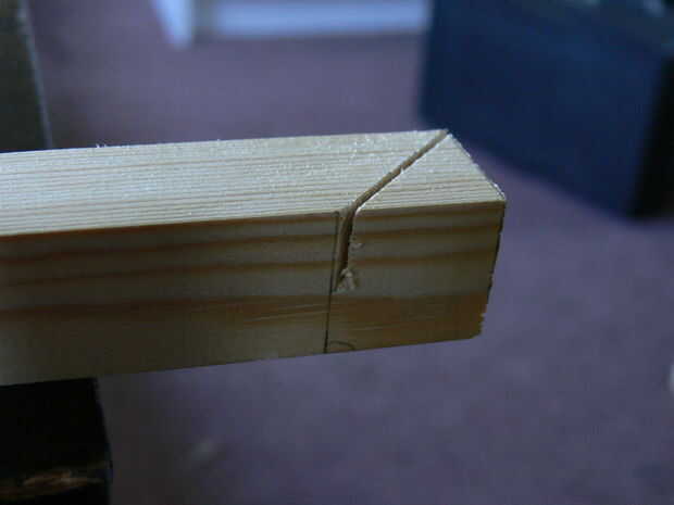 Una vez que la primera parte de la corte en su lugar, trabajar la sierra cuidadosamente por la parte trasera en la esquina (foto 4). Luego ejecutarlo por el frente, paralela a la línea de 90 grados. Tenga cuidado, reducir poco a poco, y usted conseguirá un corte perfecto cerca de 45 grados.