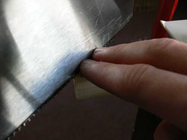 Apenas como con el pulgar en un corte cuadrado, uso un par de dedos para mantener la hoja alineada en la línea superior 45 grados mientras la primera ranura de corte.