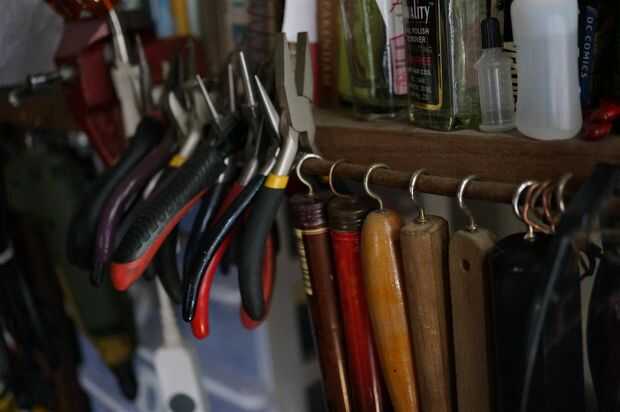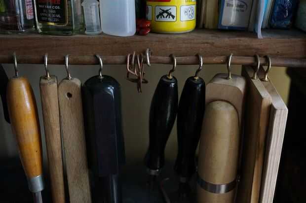 En el estante hice un rack simple con unos ganchos de tornillo y algunos reciclados tubería de cobre que tenía por ahí. Mis alicates están a distancia de los brazos cuando trabajo, y es fácil de ponerlos lejos. También, he até ganchos a algunas de mis otras herramientas (martillo, pulidora, cepillo de alambre de pin de banco, sierras etc.) a la caída para arriba.