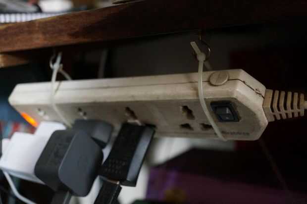Usted puede reírse de mi "conjunto" de las dos tablas, pero funciona y fácilmente puedo desmontarlo en un futuro cercano cuando es necesario. En el escritorio es un estante de dos viejos cajones de escritorio y otra tabla de madera dura en. Soy un gran fan de los ganchos y utilizarlos extensivamente.