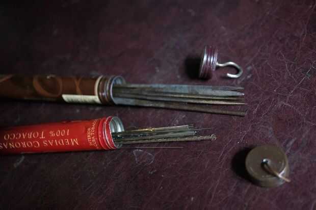 Mis amigos también estaban felices de dar me algunos tubos de puro viejo, donde almacenar mis archivos de agujas y hojas de sierra. He adjuntado ganchos sobre ellos también, para que mis archivos y láminas son fácilmente accesible y fácil de guardar demasiado.