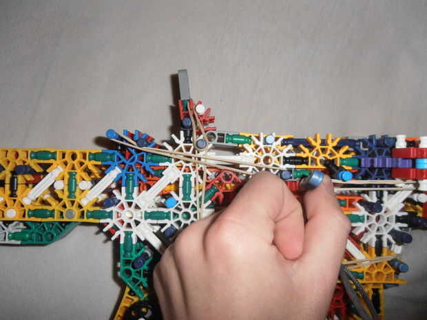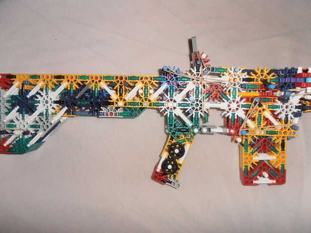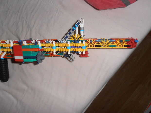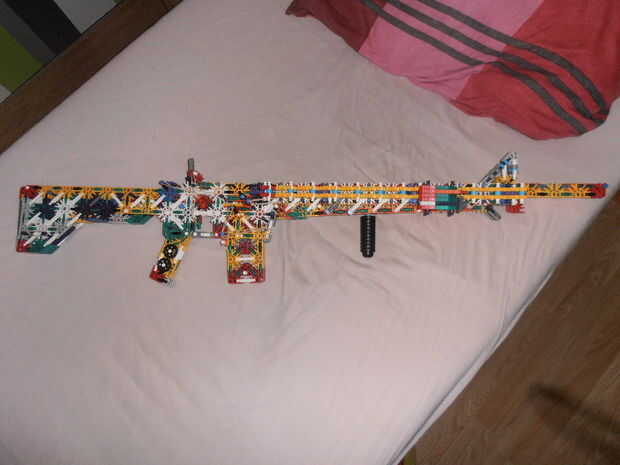 Éste comenzó como el M16 ~ KGB ~ tiene en este tema (esta arma), que era básicamente una versión modded del estilo M16 Vietnam. Quería hacer un carril HK417 sistema del cañón, similar a Knexgurl (Blue Mullet), pero al final, sólo tenía lo suficiente para hacer rieles. Esto es también por ello la acción es completamente diferente (igual que en el HK417), y por qué no tiene un llevando la manija. El receptor también se hace después M16 de Knexgurl, con algunas partes modificadas para adaptarse a 'mina'. Por lo tanto, es básicamente un cruce entre distintas armas, con piezas modificadas por mí. Tiene un interés (OMI) de carga de la manija, que funciona como una 'doble'. Pero eso se explica en las fotos y un video próximo. Al final, no se ve como un M16, parece extraño (con sólo los rieles) así que te romperán pronto y hacer algo más.