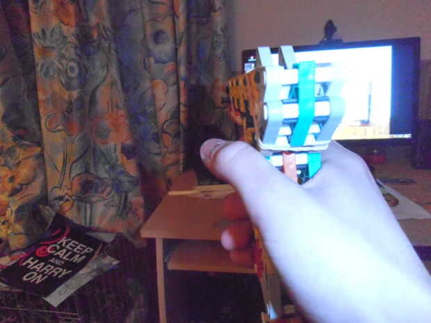 esta es una de las pistolas más pequeñas cada vez. Lo hice cuando llegué realmente aburrido un día. Realmente tiene un percutor y un gatillo! La pistola entera mide aproximadamente 2 pulgadas. Puede disparar pequeños pedazos verdes o blancos. Preferi