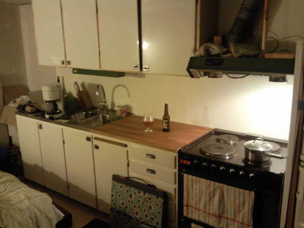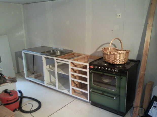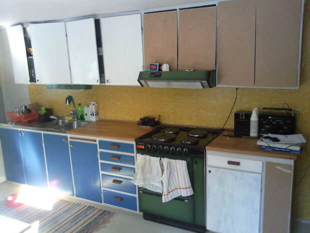 Tenemos una cocina usada de 1940-50 ~ 120 euros, un fregadero gratis, un nuevo banco para ~ 150 e y alguna pintura para 30 e.