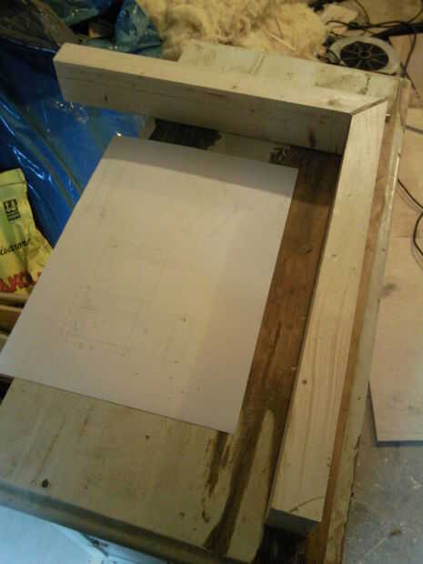 Fue hecha la base de un poste de madera de abeto de 45 x 95 mm que fue cortado a 45x80mm con el émbolo cortado la sierra. Se realizó cerca de ocho centímetros más pequeño que la madera base para hacer espacio para los pies al estar de pie por el Banco. La esquina era beveld y alisa con lija para reducir el riesgo de golpear un dedo del pie en él. Piecs base pusieron juntos y asegurada al piso por tornillos 6x80mm.