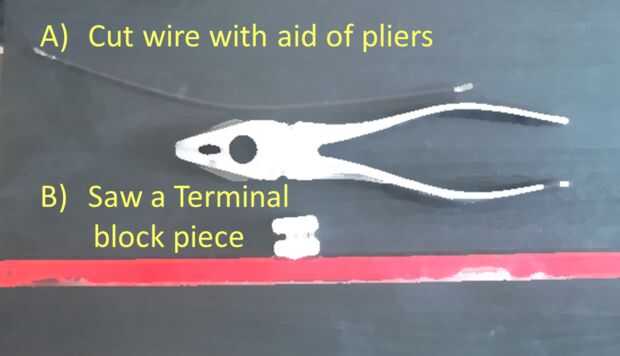 Luego cortar un trozo del bloque de terminal de tornillo (subsegmentos tornillo 4 como se muestra en la fotografía) con la ayuda de la sierra (intento hacerlo limpiar y eliminar bordes afilados)