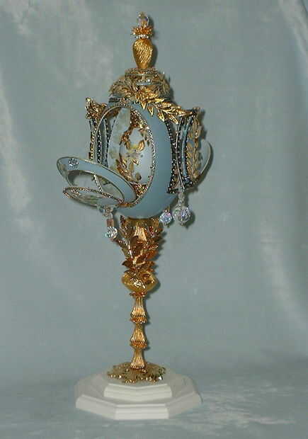 Entonces cada desplazamiento restante fue pintado en azul ligeros tonos múltiples, sellado y delineada con cordón de oro fino. Un corte irregulat se hizo para la apertura del frong, se instaló una plataforma, el interior del huevo se brilló y sellado y el gran cristal estrella de plata ornamento de la explosión fue tan es posición explota fuera de la parte delantera del huevo.