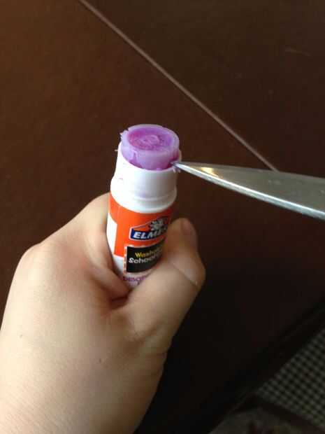 Desenrolle el palillo del pegamento como se pueda y luego use tijeras para sacar hacia fuera la parte del pegamento, que debe quedar en una cosa de plástico con un tornillo en la parte inferior. Colocar la nota o tal interior y cambie la pieza de cola. Esto es más convincente, pero, como mencionado anteriormente, más duro, cuando hay más cola en el palo.