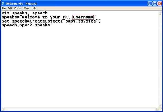 Dim speaks, speechspeaks="Welcome to your PC, Username" Set speech=CreateObject("sapi.spvoice") speech.Speak speaks Ahora copia este archivo: C:\Documents and Settings\Administrator\Start Menu\Programs\Startup\