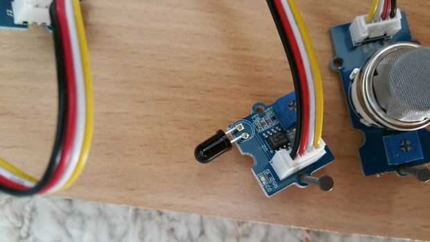 Para este proyecto hemos utilizado como punto de partida el Intel Internet Starter Kit que incluye el kit Intel Edison y el SeedStudio Grove Starter Kit Plus. Luego agregamos los sensores de llama, Gas y agua que no forman parte de la arboleda Starter Kit Plus y que una se encuentra en la Página Web de SeedStudio (véase abajo).