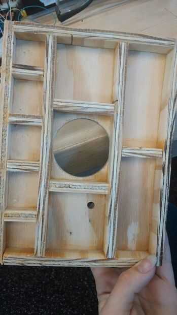 A fin de que sea una caja de joyería, debe tener un lugar para joyería. Corte un pedazo de madera en su caja y luego cortar un agujero lo suficientemente grande para su bailarina quepa fácilmente. Añadir trozos pequeños de madera para crear compartimentos de cualquier tamaño que desea. Para alcanzar el botón en el arduino, necesita hacer una varilla de madera pequeña y un taladro para justo encima de donde va a colocar el botón de arduino. Después de hacer esto, usted necesita para asegurarse de que el estante no ir hasta el fondo y aplastar su arduino. Hacer pequeños bloques rectangulares la altura deseada la plataforma levantar y pegar en las esquinas inferiores.