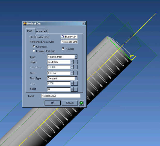 este instructable es creando un externo "hilo" en Alibre Design. Este es un método cosmético, ya que utiliza una revolución y patrón, en lugar de un Corte helicoidal, como en el método 1.Como en el método 1, se trata de un montante de 50 mm con