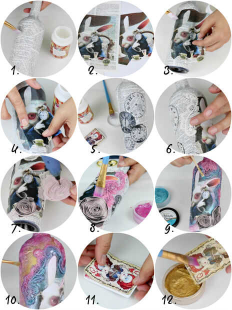 5. decoupage otras imágenes en la parte posterior de la botella * que utiliza relojes para la botella de conejo blanco