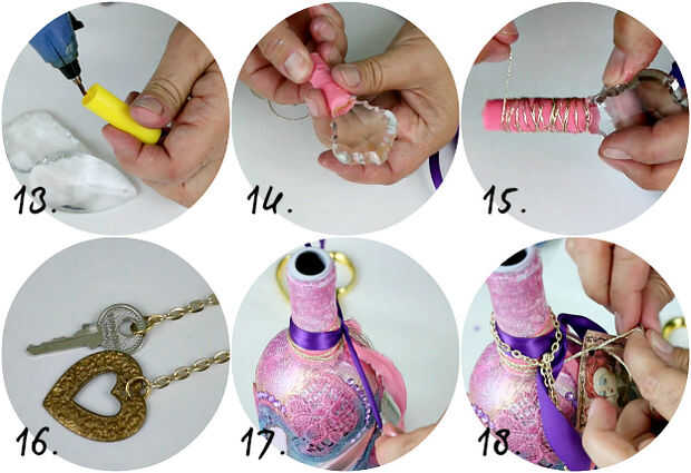 17. y 18. La cinta, cadena y tiras de tela alrededor del cuello de la botella y luego la tarjeta hasta el final de uno de los hilos de suspensión