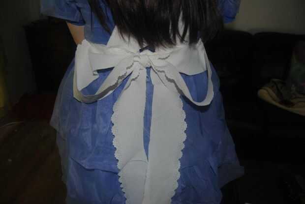 El vestido: He buscado por todas partes para un vestido azul que parecía similar a la que Alice lleva en el juego pero no pudo encontrar uno! Por lo que en época de halloween fui a descuentos (una tienda popular op) que vende un montón de accesorios de halloween alrededor de ese tiempo, y me encontré con esta gran hinchada vestido transparente. Inmediatamente tuve la idea de morir el vestido azul e ir de allí. Después de morir él, salió un color transparente azul-púrpura no funcionó exactamente como estaba previsto pero aún no estaba mal. Que cortar piezas de material de uno de mis viejos vestidos de azul oscuros y cosido a las mangas puffy del vestido para hacer el color azul más.