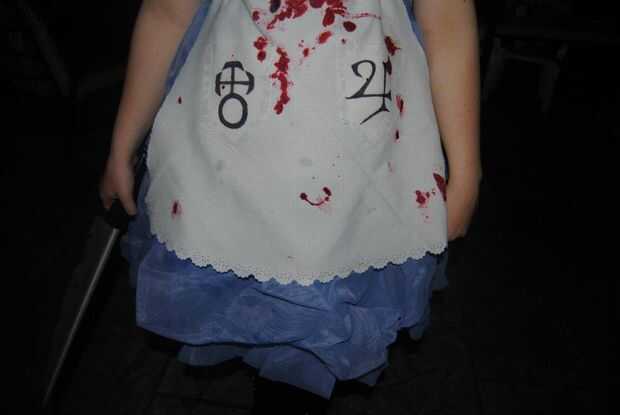 El delantal: Utilicé un viejo paño de tabla y cortar la forma de un delantal que cubre el pecho y se fue encima de la cabeza, luego coser los lados del corte del listón para evitar cualquier desgaste. Tomé una camiseta blanca vieja y corte para hacer los bolsillos, impreso que luego cosió sobre el delantal y pegar símbolos en los bolsillos con una pistola de pegamento caliente. La sangre falsa que hecha de jarabe de chocolate mezclado con colorante alimentario rojo, funciona muy bien. (también fue utilizado en el arma)