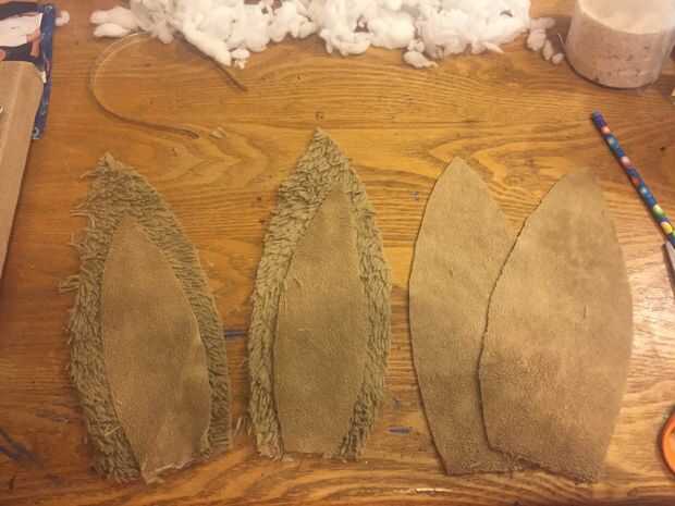 Saqué una plantilla que usé para cortar la parte delantera y la parte posterior de cada oreja. Utilicé el lado esponjoso para el frente de la oreja y el lado menos suaves para la espalda y el interior del oído. Pensé acerca del uso de color de rosa por dentro, pero sólo decidió utilizar el lado menos esponjoso y ojo solo había mirado qué tan grande debe ser.