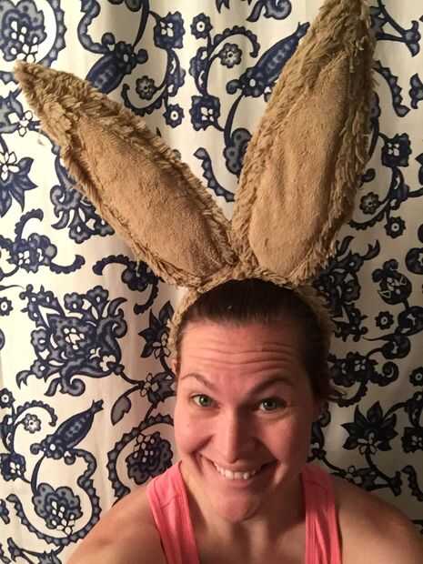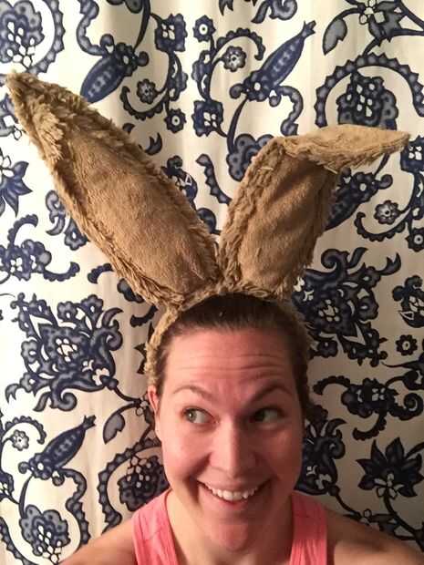 Dobló una de las orejas un poco para darles el carácter de la liebre de marzo. También creo que se ven más como orejas de conejo y menos como orejas de burro cuando uno está doblado. Voy a intentar tomar una foto de mi marido con su pintura de traje y cara completo a compartir.