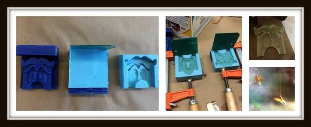 Puesto que mis paredes cortaron, tuve que usar algunos trozos de plástico como pared paredes improvisadas construyendo mi molde de silicona. Eran fáciles de colocar en el molde de cera. Hice mi molde Oomo (fun!) y luego del molde de plástico SmoothCast. Las piezas resultaron de gran! He comprado algunos pintura en aerosol oro de artista y artesano y aerosol pintado las piezas.