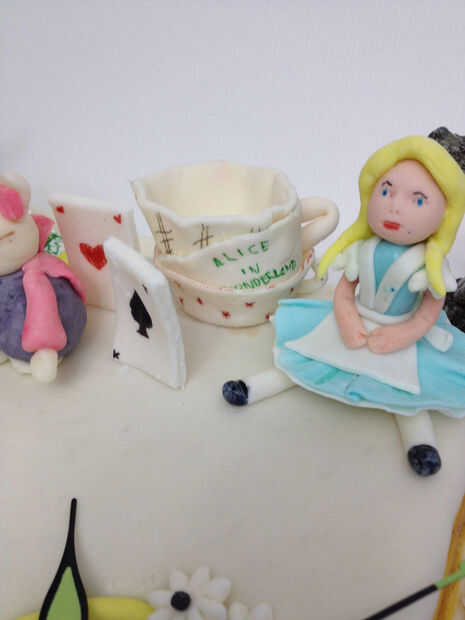 Para Alicia, del fondant blanco, teñir con azul, con líquido o gel colorante y para la cara y las manos, con un pequeño cobre gel colorante de alimento